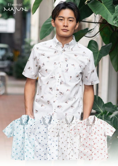 涼し気で上品な白地の生地に主張しすぎないヤンバルクイナの柄がとてもオシャレで、いかにもかりゆしウェアといった感が無いので内地でも着やすい1枚です。